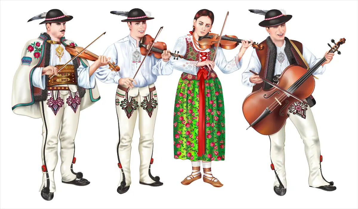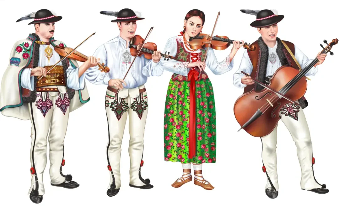 Tradycyjny zespół góralski w strojach góalskich męskich i damskich